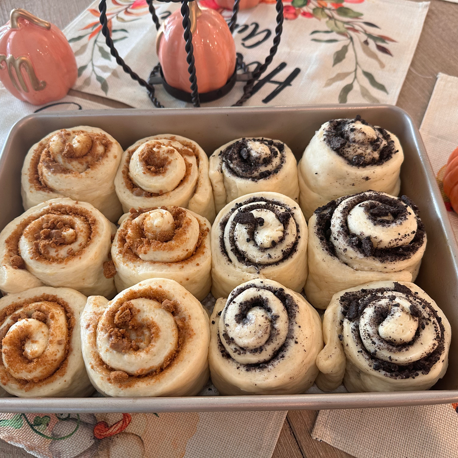 A playful spin on the classic roll, these are packed with Oreo cookies pieces in every swirl. Topped with cream cheese frosting and extra crumbles. They are as fun to look ash they are to eat.